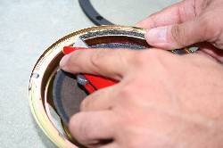STAP VIER: LIJM DE RAND OP DE WOOFER. Breng lijm aan op de nieuwe luidsprekerrand en verspreid het. Breng ook lijm aan op de woofer. Zorg dat de lijm op de woofer niet 'uitloopt'. Breng de nieuwe luidsprekerrand aan midden op de woofer. Druk zachtjes aan. Neem de tijd, werk langzaam en nauwkeurig. Het verdient aanbeveling om een 'ring' te gebruiken (bijvoorbeeld een pan / schaal) die je op de rand kunt leggen die continu druk uitoefent. Op die manier krijg je een perfecte hechting van de lijm. Professionals gebruiken hiervoor cirkelvormige mallen die ze op de gelijmde rand leggen met daarop iets van gewicht. (Zorg dat het gewicht niet te groot is - 500 gr. is veelal meer dan voldoende....) Soms moet de rand achter de conus gemonteerd worden. | ||||||||