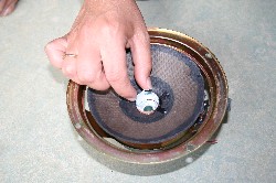 ![]() VERWIJDER DE STOFKAP. LET OP: VEELAL (99,9%) IS DEZE STAP NIET NODIG en volstaat STAP 5! Leg de woofer horizontaal op de rug. Beweeg de conus neerwaarts volgens een rechte lijn. Voel je weerstand of hoor je iets schrapen - verwijder dan de stofkap - je moet de woofer opnieuw uitlijnen (stap 5). Voel je geen weerstand en kan je de conus vrijelijk indrukken dan is de centreerring nog goed en is de woofer nog gecentreerd. Je kunt de stofkap op zijn plaats laten - tenzij de stofkap beschadigd is en je de stofkap daarom wilt vervangen. | ||||||||